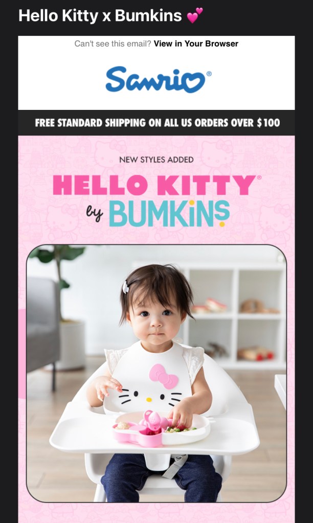 Sanrio has also emailed me about a collaboration with Bumkins, which is not relevant to my interests – but is based in Phoenix! I click the link anyway. The advertisement link leads to the kids clothing & shoes section of the site.