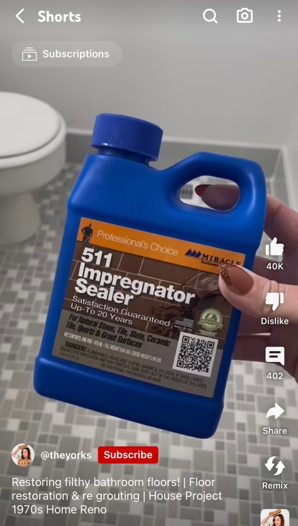 5:30pm – With an interest in home repair, I watch a YouTube short about restoring the tile of a bathroom. @TheYorks channel is dedicated to DIY home restoration and I trust their judgement. To do my due diligence, however, I located a similar impregnator sealer used in the video and verified the reviews on the Home Depot website. It appears this is an excellent product.