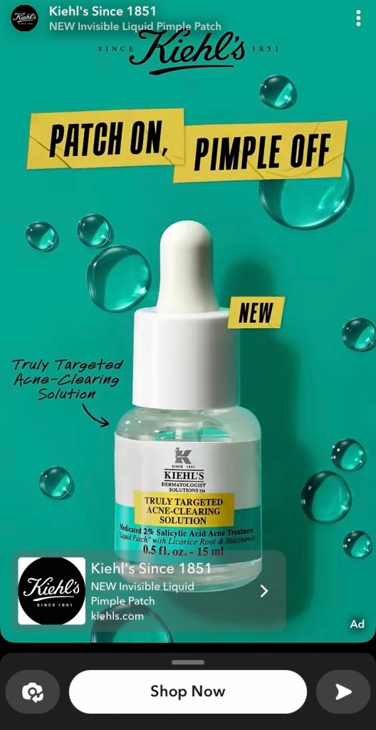 8:00pm – Giving Snapchat another chance, I see an ad for Kiehl’s Truly targeted acne-clearing solution. After a quick Google search, I find the company truly has been around since 1851 according to the National Library of Medicine.