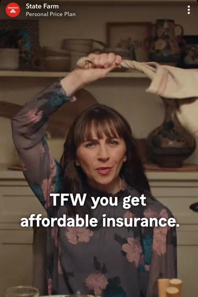 5:15pm – State Farm makes an attempt at being relatable via Snapchat advertisement during dinner. The ad displays a woman swinging a cloth napkin above her head while at a dining table, with the caption “TFW you get affordable insurance.”