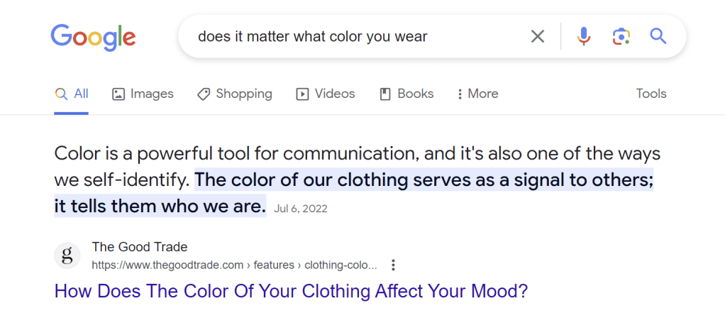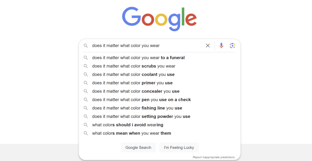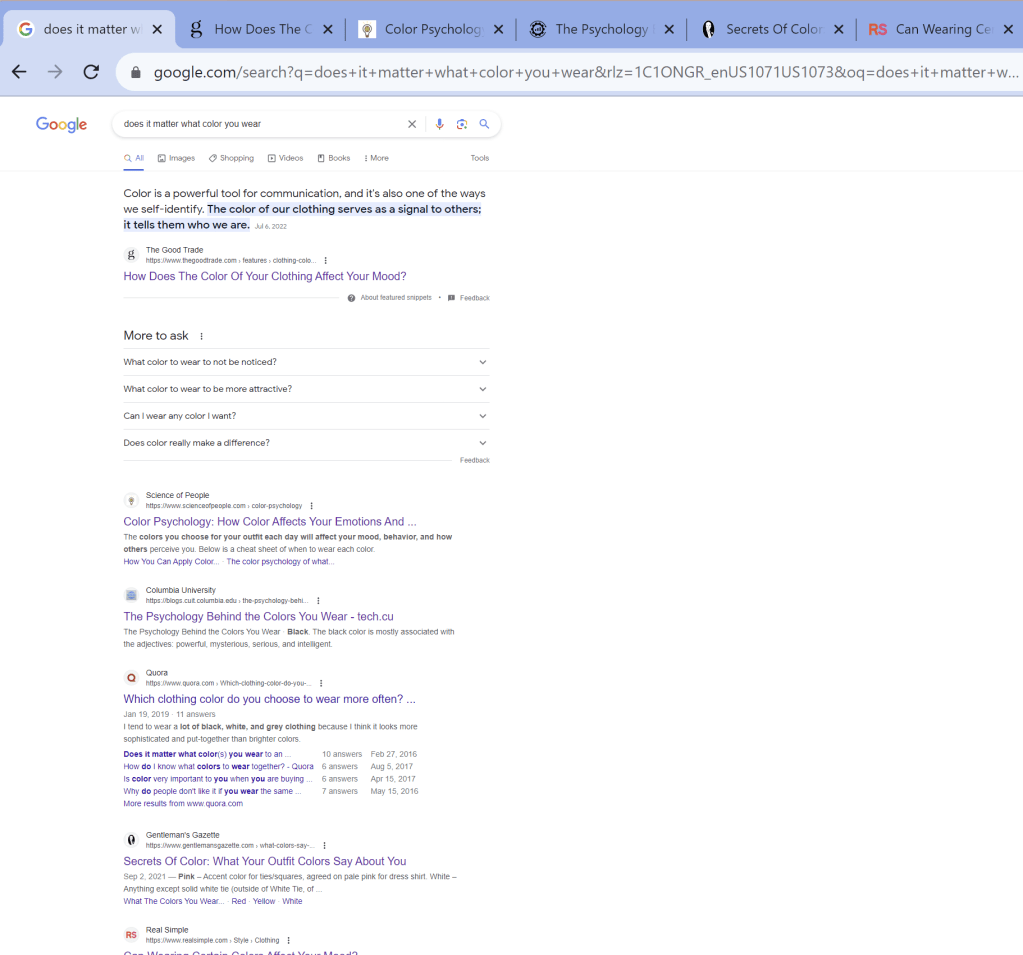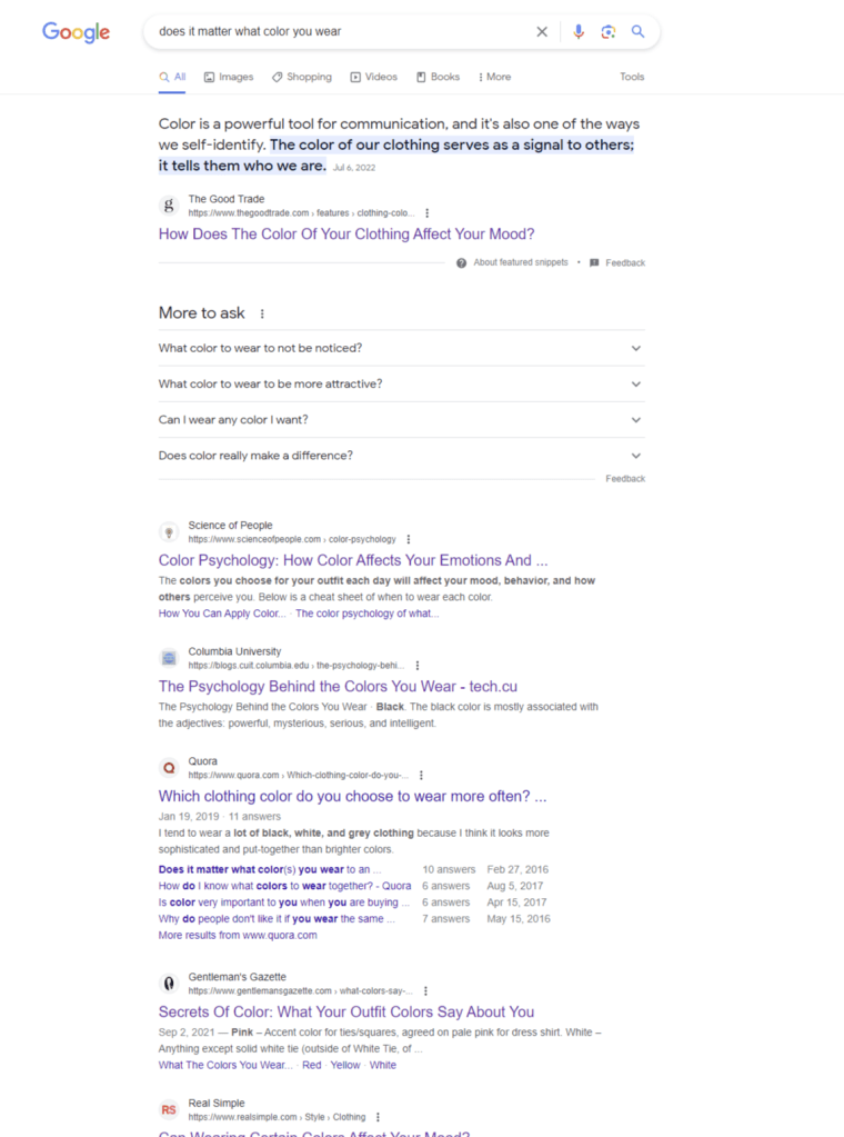 Select a search engine of your choice: DuckDuckGo, Google, Ecosia, Yahoo.. and enter the phrase under investigation. For instance, I will search “does it matter what color you wear” on Google as I am most familiar with it.