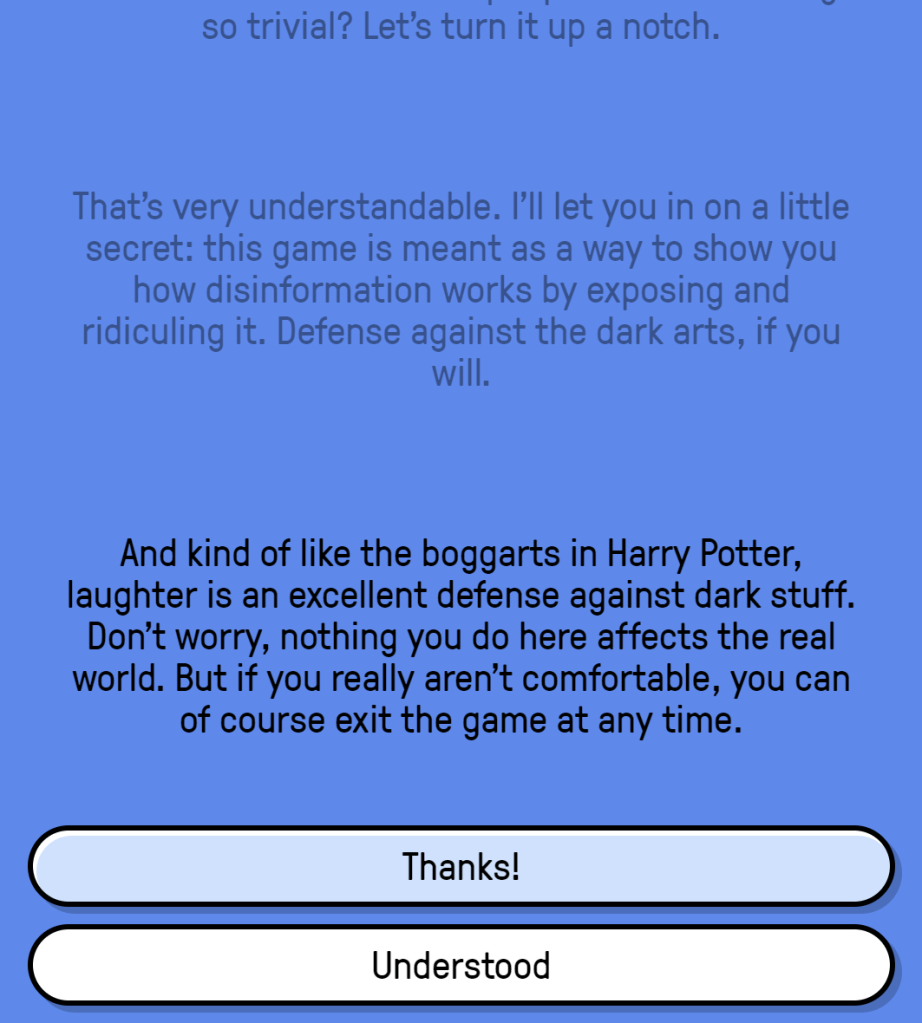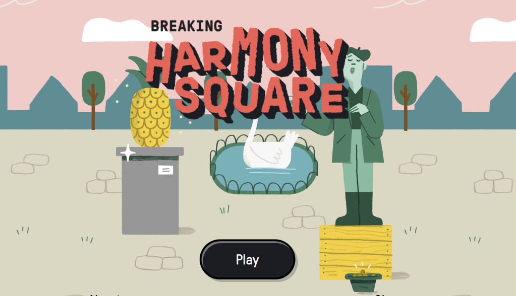 do so as it was for learning purposes.The art style is charming and scientists helped create it! The About section (lower left) explains, “Scientists who worked with us on the development of this game found that playing Harmony Square improves people’s ability to spit manipulation techniques in social media posts, increases their confidence in spotting such techniques, and reduces their willingness to share manipulative content with people in their network. The results of this study were published in the journal Harvard Misinformation Review, and can be found here.”