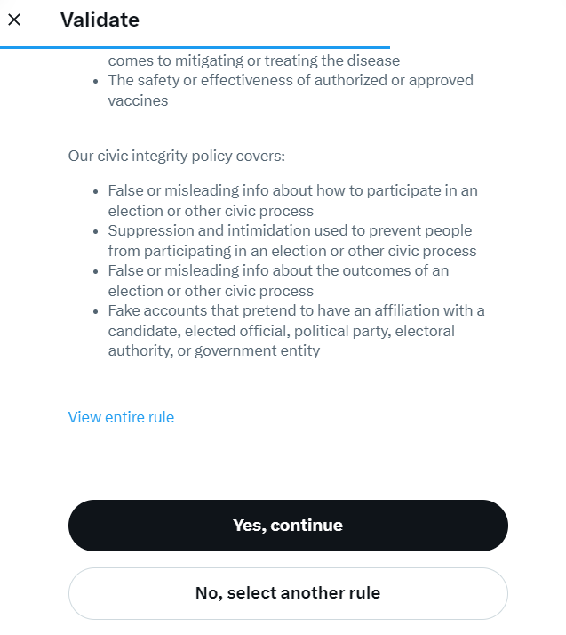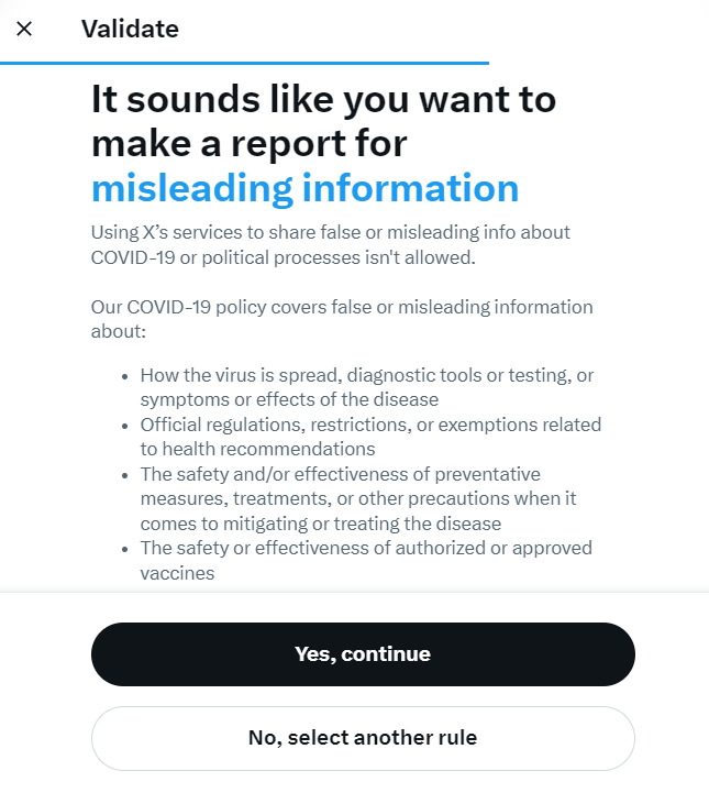 For example, I went to falsely report the first post I saw on Twitter to view the steps without submitting anything. It was made clear that reporting misleading information was only important if it was related to health or politics.